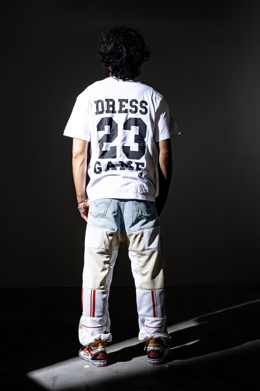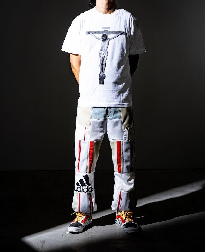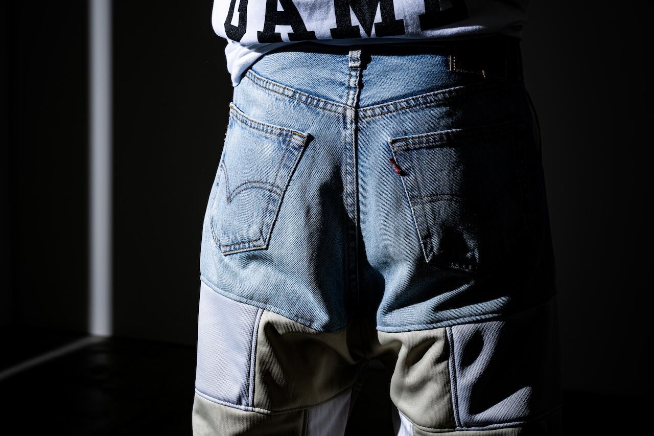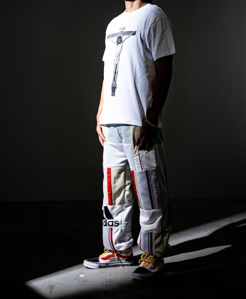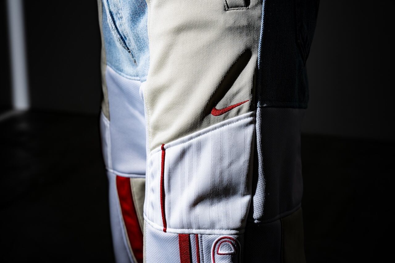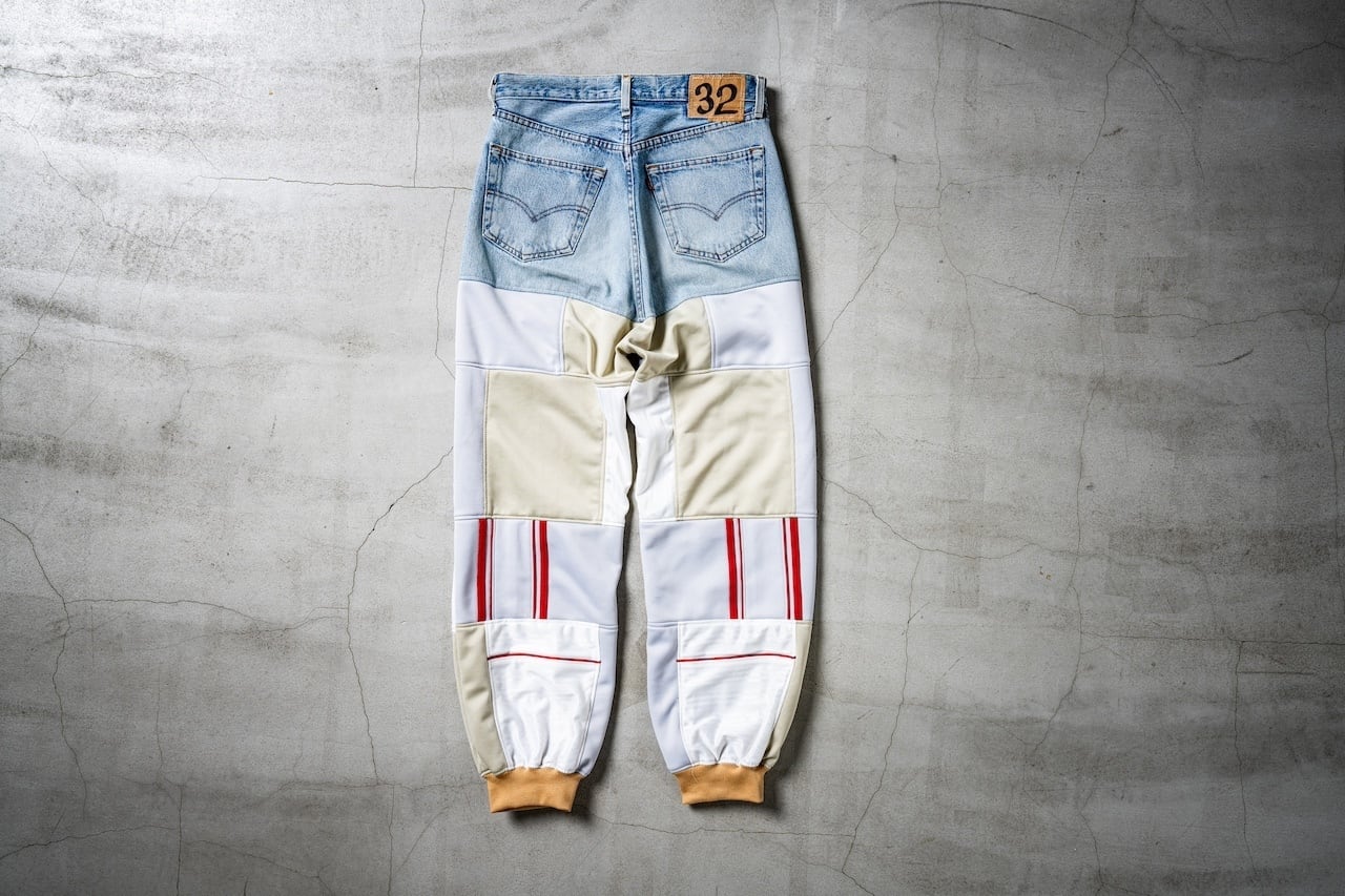 ・デニム素材とスポーツアイコンのコラージュパンツです。